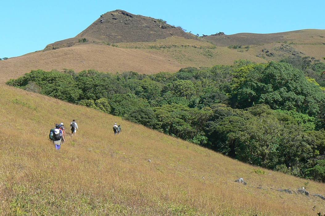 Morning we woke up the call of the Malabar whistling thrush in the bushes. A group began to pack the tents and prepare breakfast. After a cold bath in the waterfalls, followed by hot breakfast walked in the opposite direction on new path. We climbed uphill and reached the grasslands, we had a glimpse of ramparts of Ballalarayan durga fort. The shoal forest in the middle of grasslands added to the fabulous views. There was no water along the route we descended into the forest and visited the forest built by ruler of that time. The Ballalarayana Durga fort was constructed by the wife of Veera Ballala who was the king of the Hoysala Empire in the 12th century. The Hoysalas were known to be patrons of art and architecture and built several temples and a few forts during their tenure. The Ballalarayana durga (fort ) was built in the Karnata Dravida style of architecture, the architectural style that was popular in the Hoysala Empire during their rule.