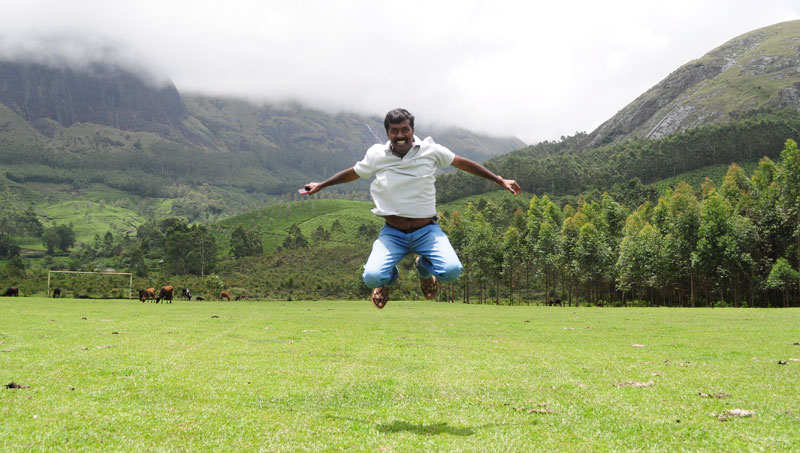 After driving another fourteen kilometers, there was another gate and this marks the maximum limit till which you can take your vehicle. We parked our car and were accompanied by Jobi for a beautiful two kilometer walk to an out worldly experience. The beautiful valley surrounded by hills and trees was there to greet us. We explored the entire valley and enjoyed clicking the nature. Here you can see Jobi trying his jumping skill and it is one of my favorite shot from my Kerala trip.