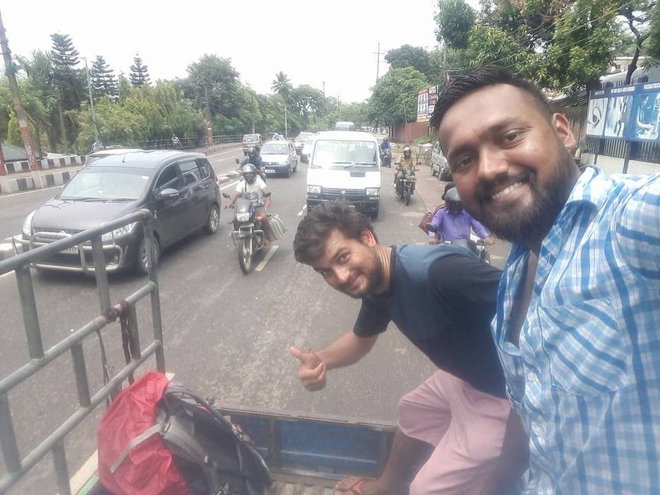 In 2nd Day, we reached Kamakhya railway station around 10:00 AM. We were instantly welcomed by the rain and moved towards the main road and got the first hitch in a Carrying Goods Auto which dropped us till the Kamakya temple Gate. After we got a second hitch in a Car for the uphill till the Temple from the gate. I had a bath there in the pool located inside the temple and trust me, it was biggest re-leaver of the pain through the entire journey. It was too much rush that day that 's the reason we can't be able to do the darshan hence we prayed from the outside & then went straight to the Bhojan Ghar for Bhojan (Free). Then Udit Das came to pick up both. He hosted us today in Guwahati. Udit Das is a travel adventure and we really appreciate his efforts on picking us from the temple and provide us shelter for the day in strange but friendly city of Guwahati. It was tiring day and we went into deep sleep after reaching his home and started dreaming for the upcoming days. Here is our selfie from auto rickshaw who provided lift till the temple gate and it was great trip must day. The drive was very friendly and an amazing person must say. We are very thankful to him for providing this help. This prove that people from all around the world are friendly if we respect them.